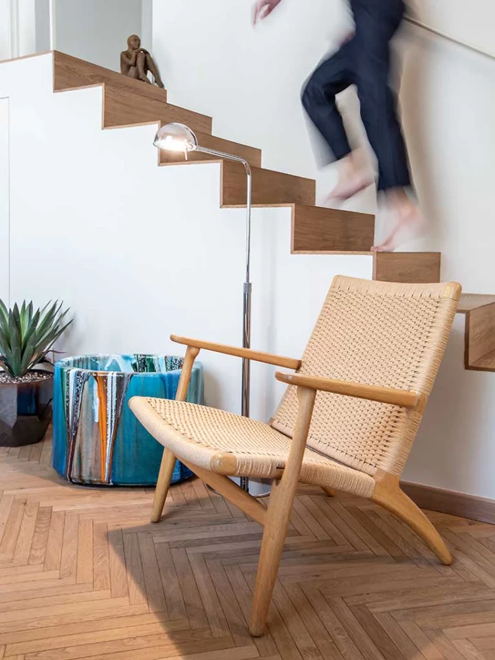 Abbiamo abbattuto solo un piccolo muretto, ma ridisegnato completamente l’atmosfera della casa: nuove palette di colori per le pareti, carta da parati selezionata con cura – e in alcuni casi anche ridisegnata – parquet rinnovato in tutta la casa e punti luce ripensati, perché l’illuminazione fosse più “casa” e meno “locale pubblico”.